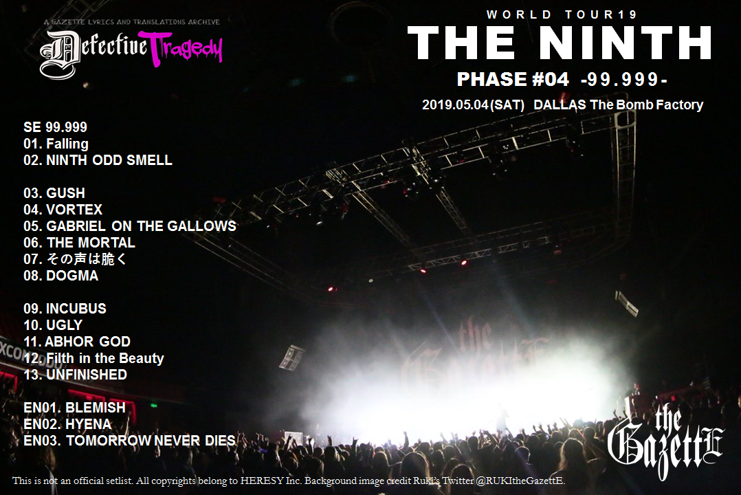 Below are the set lists from the North American leg of WORLD TOUR19 “THE NINTH” PHASE #04 -99.999- as performed by the GazettE.