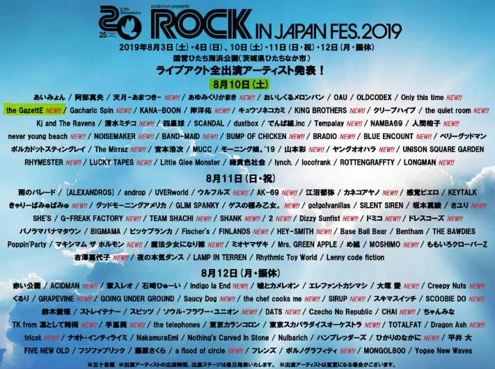 It has been announced that the GazettE has been added to the lineup for rockin’on‘s ROCK IN JAPAN FESTIVAL 2019 in August.