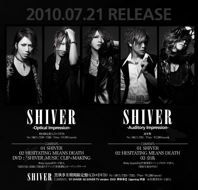 SHIVER, the single, was released in three editions: SHIVER-Auditory Impression-, SHIVER-Optical Impression- (初回生産限定盤 / First Press Limited Edition), and the Kuroshitsuji II Limited Edition SHIVER (黒執事II期間限定盤 / Black Butler II Limited Edition).